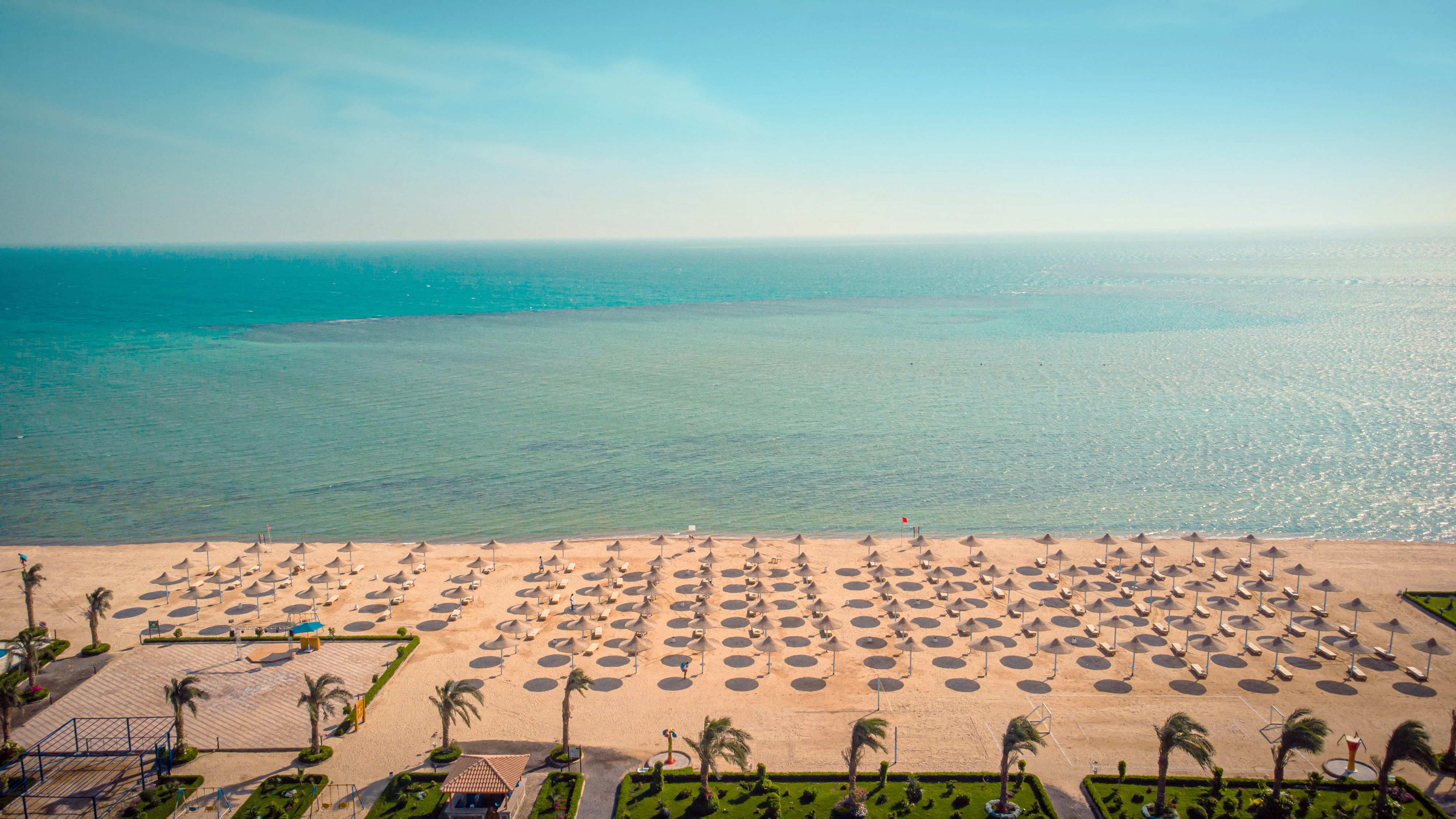 Собствен, пясъчен. Чадъри, шезлонги и плажни кърпи на плажа и при басейна – безплатно.