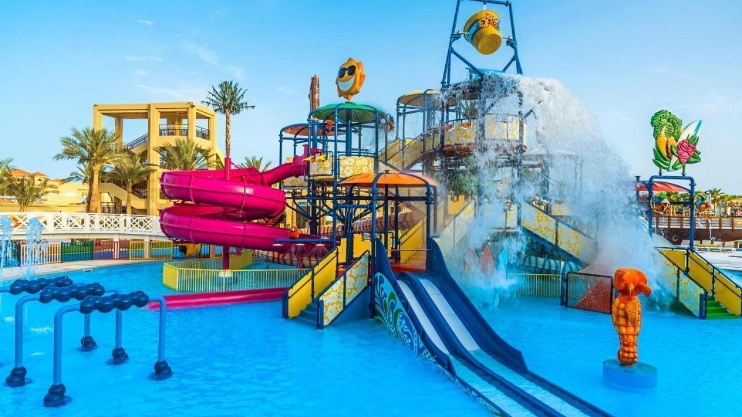 Има 6 кули с 23 водни пързалки, големи интерактивни водни фонтани, аква кула, бавна река и басейн с вълни.