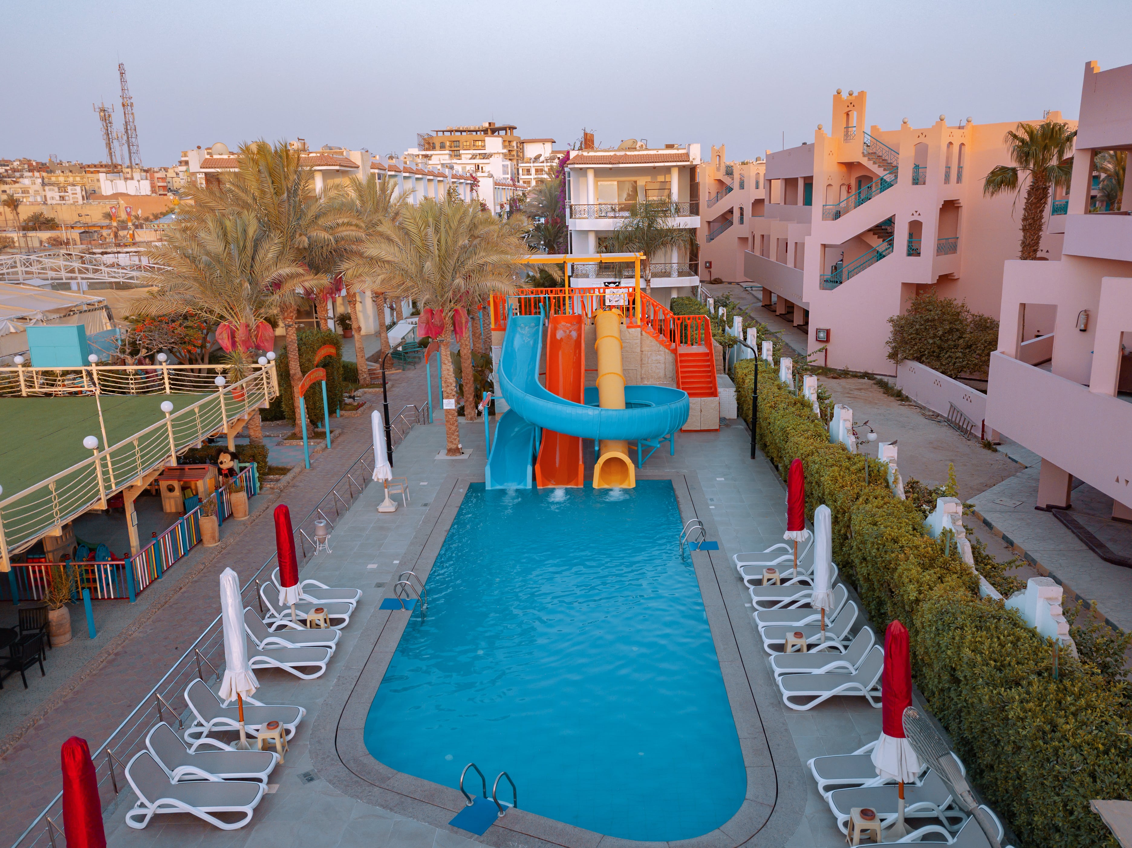 Намира се на 6 км. от летище Хургада, в Саккала - центъра на Хургада, на брега на морето. Посторен през 1999 г., частично реновиран през 2010 г.