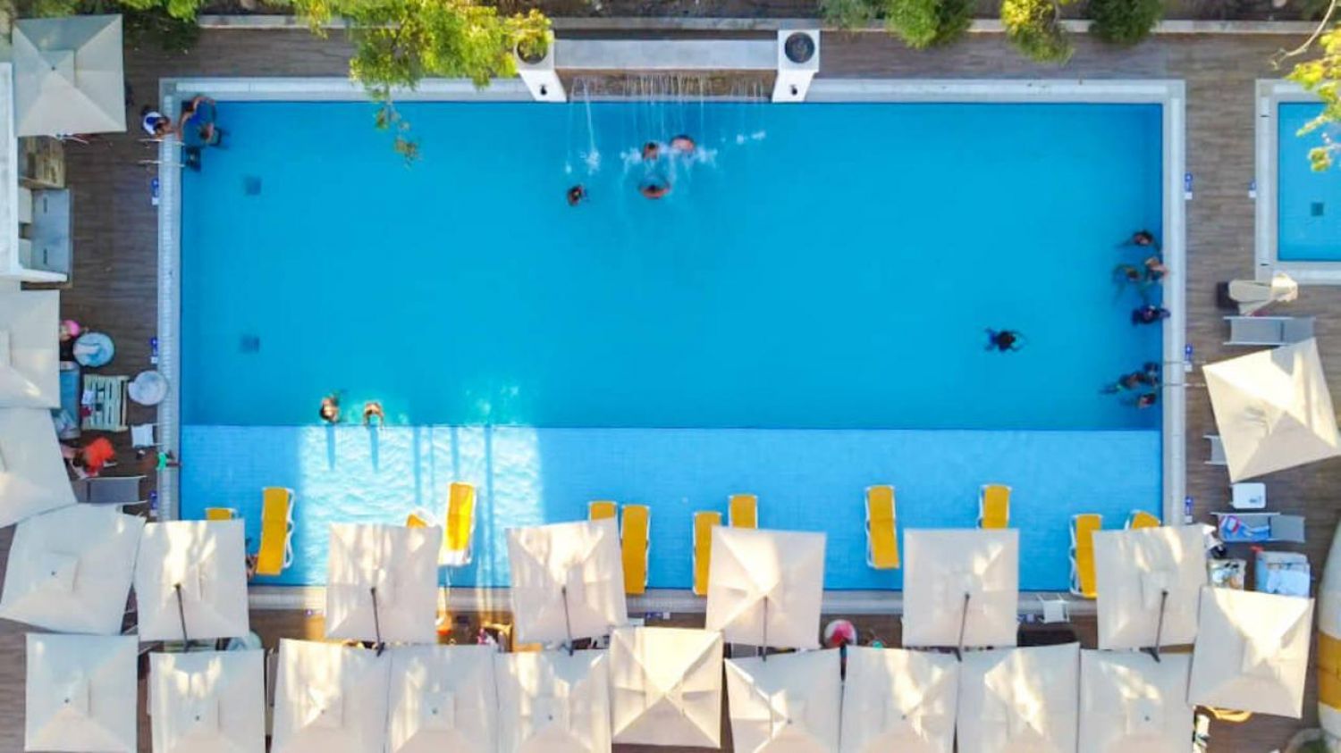 - Шезлонги и чадъри край басейна