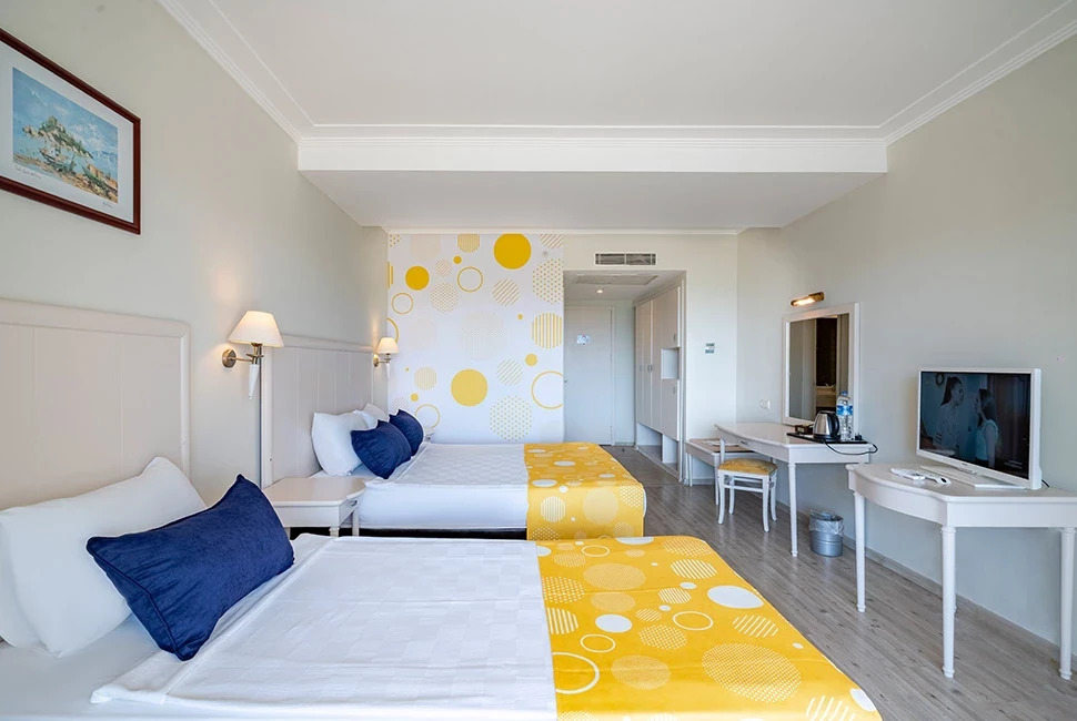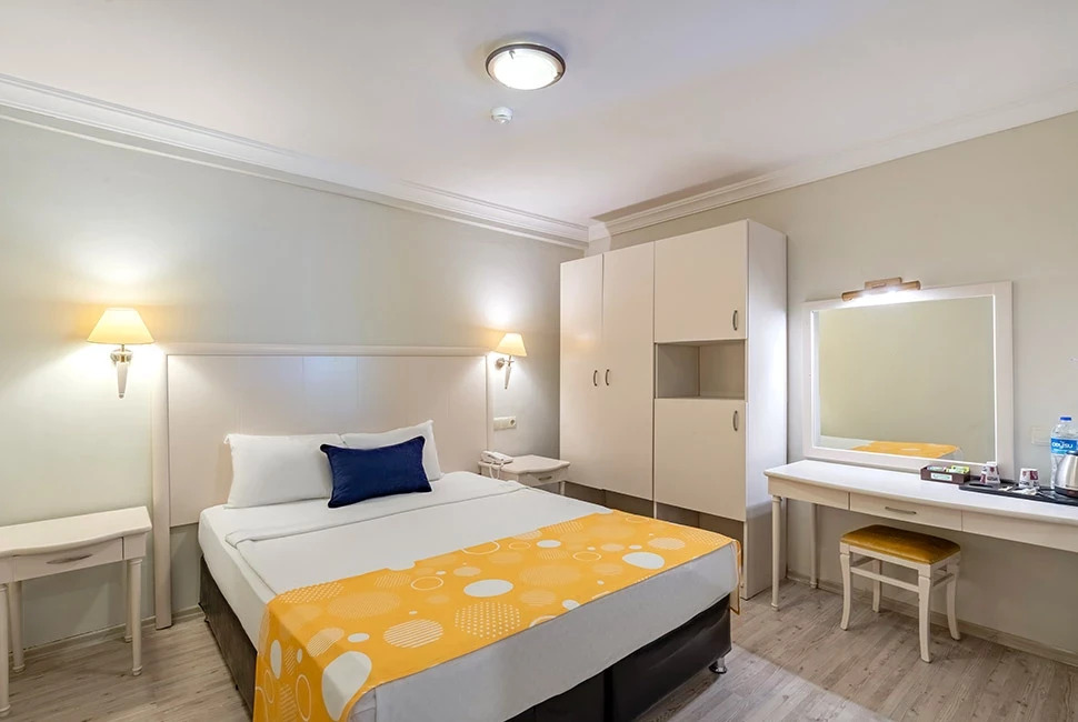 Хотелът разполага с общо 234 стаи, разположени в една 6-етажна основна сграда Main Building, от които 151 стандартни стаи Standard room land view (изглед суша - 30 м2), 40 стандартни стаи Standard room sea view (изглед море - 30 м2), 10 стандартни стаи Bunkbed room (спалня + двуетажно легло - 30 м2), 31 фамилни стаи Family room (2 спални, 1 бяна– 35 м2), 2 стаи за инвалиди. Всички стаи са оборудвани с климатик, телефон, телевизор, баня с душ/вана, минибар (вода и безалкохолни напитки – безплатно, само при пристигане), сет за кафе/чай, сейф (безплатен). Почистване на стаите - всеки ден, смяна на кърпите – при поискване, смяна на спалното бельо – 2 пъти седмично.