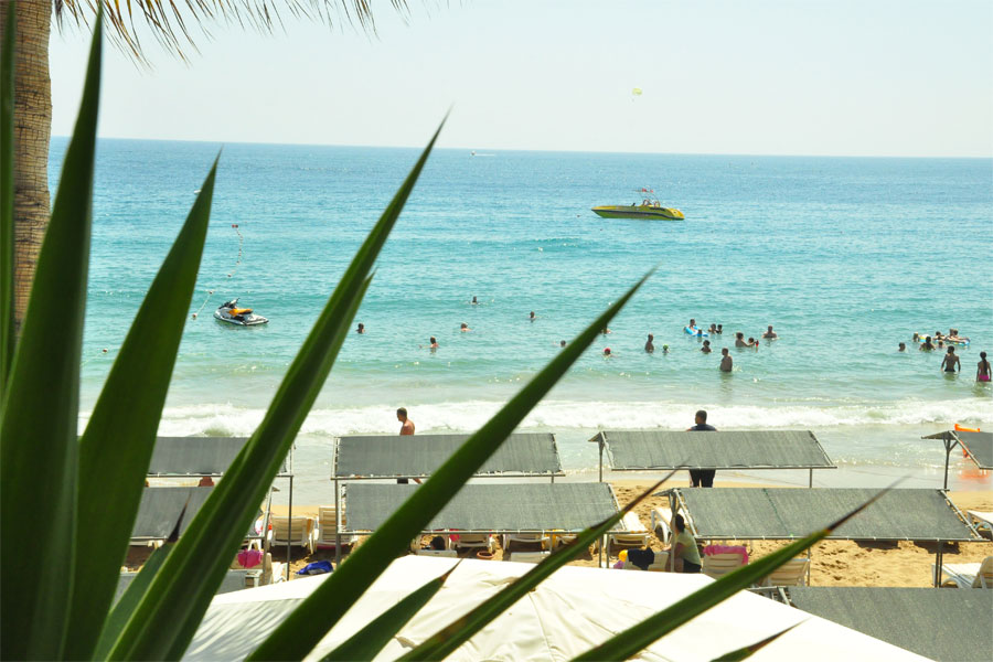 Собствен, чакълест, на 450 м, през подлез. Чадъри, шезлонги на плажа и при басейна – безплатно. Плажни кърпи – срещу заплащане.