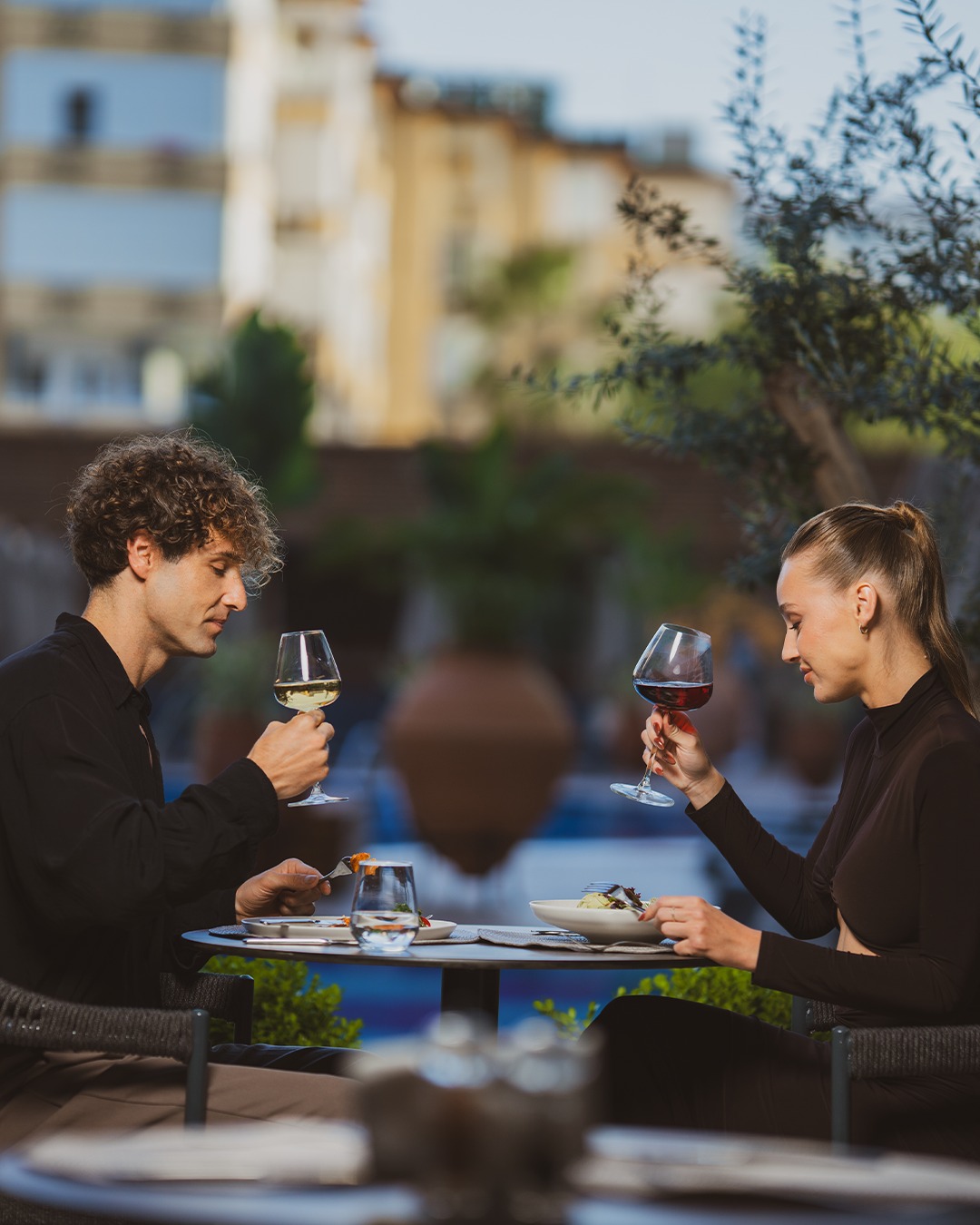 Основен ресторант, сладкарница, лоби бар, лаундж бар, бар при басейна, плажен снек бар, открит басейн, фитнес, конферентна зала.