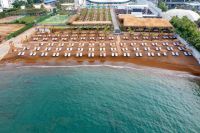 Собствен, платформа и пясъчно - чакълест. Чадъри, шезлонги и матраци на плажа и при басейна – безплатно, плажни кърпи – безплатно.