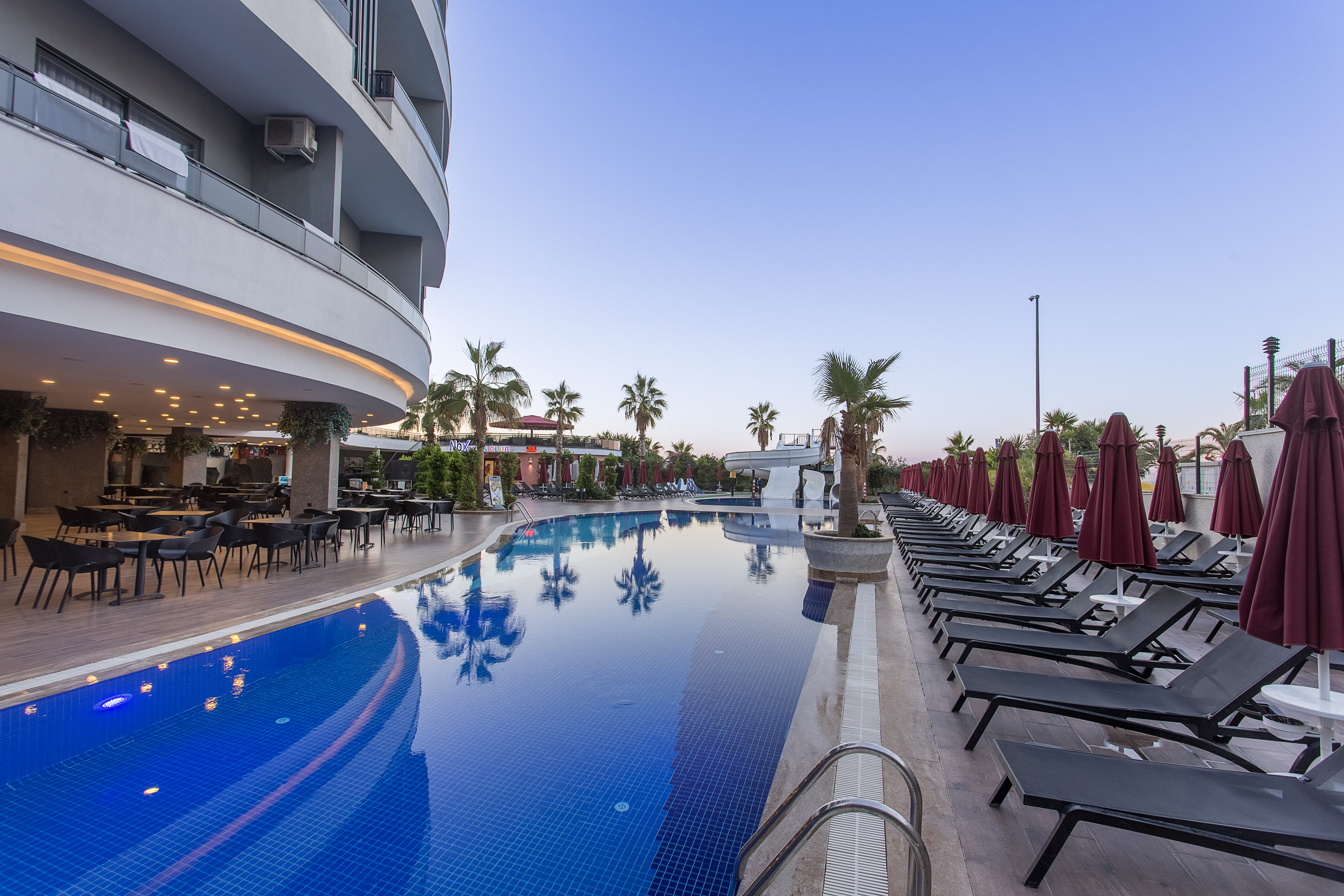 Основен ресторант, 2 а - ла - карт ресторанта (турски, италиански – 1 безплатно посещения на един от тях, с предварителна резервация), 3 бара (от които един работещ 24 ч.), открит и закрит басейн, 2 водни пързалки, СПА център, магазини, паркинг, Wi-Fi (в Лоби). За децата: Открит басейн, детска площадка, мини клуб (4-12г.), детска количка (платено), мини диско. Безплатни услуги: Сауна, турска баня, парна баня, тенис на маса, фитнес, дартс, степ аеробика, водна гимнастика, водно поло, жива музика, анимация. Платени услуги: Масаж, пилинг, фризьорски и козметичен салон, химическо чистене, лекар, детегледачка, фотограф, водни спортове, рент - а кар.
