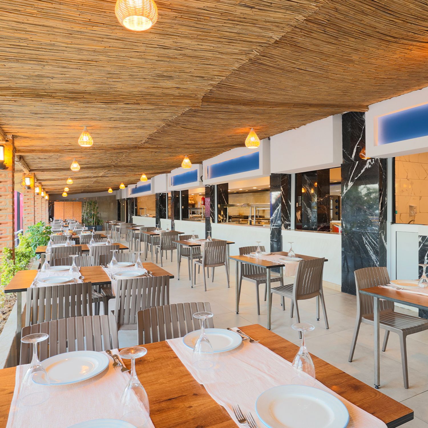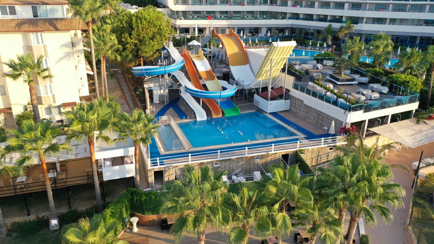 Основен ресторант, 1 а-ла-карт ресторанта (1 безплатно посещение при минимум 7 нощувки, с предварителна резервация), 1 снек ресторант, сладкарница, 3 бара, 2 открити басейна, 4 водни пързалки, СПА център, магазини, паркинг.