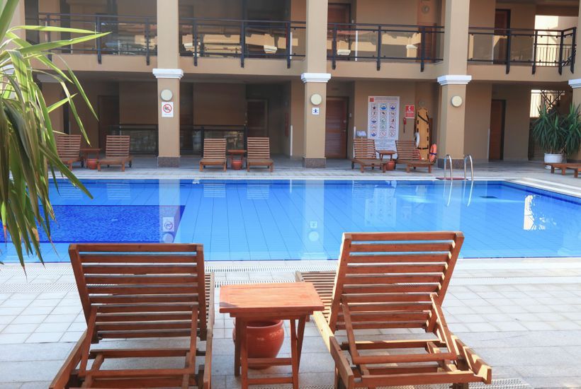 Собствен пясъчен плаж. Чадъри, шезлонги, матраци и хавлии - безплатно. Бар на плажа - безплатно.
