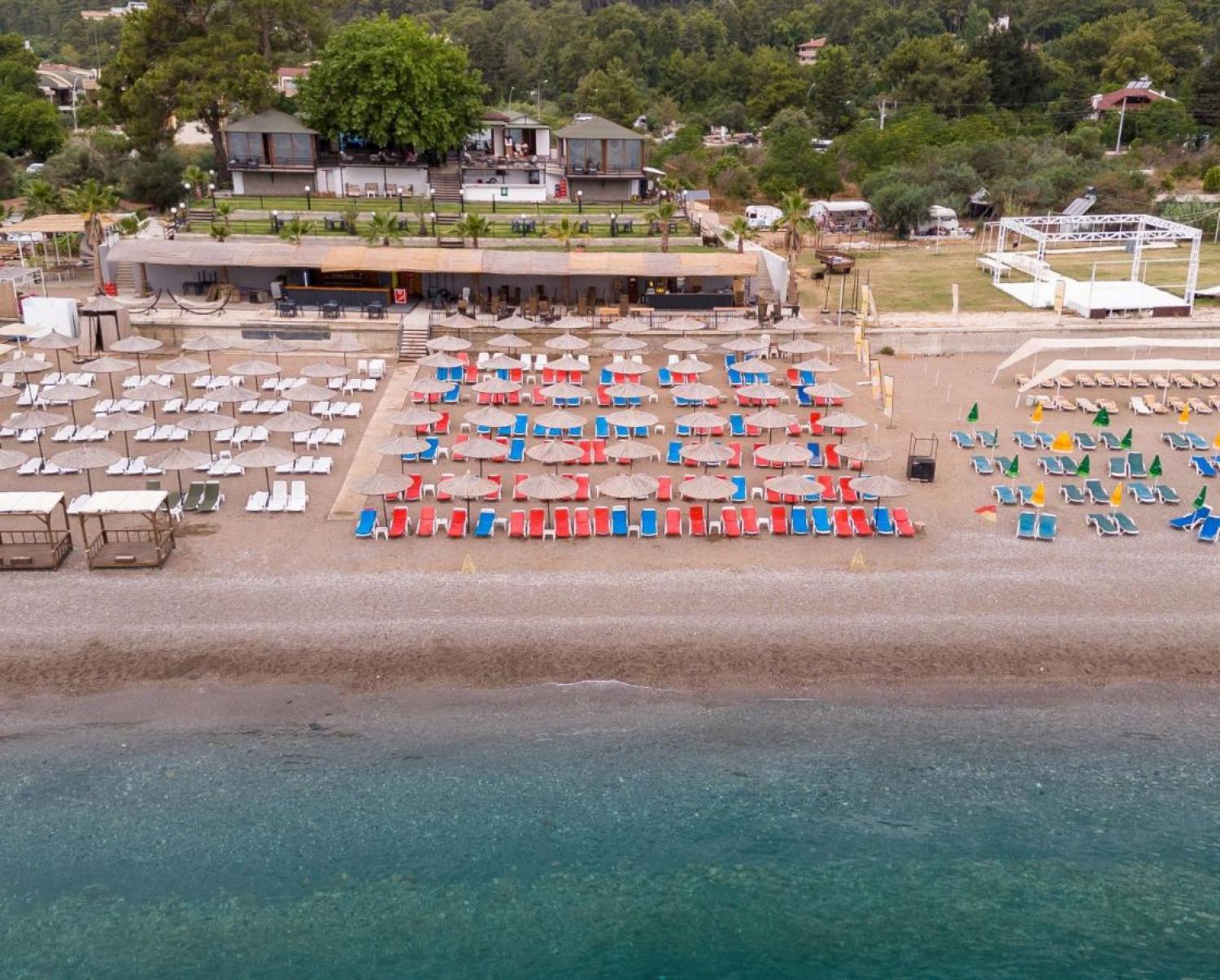 Собствен, пясъчно - чакълест. Чадъри, шезлонги и плажни кърпи на плажа и при басейна – безплатно.