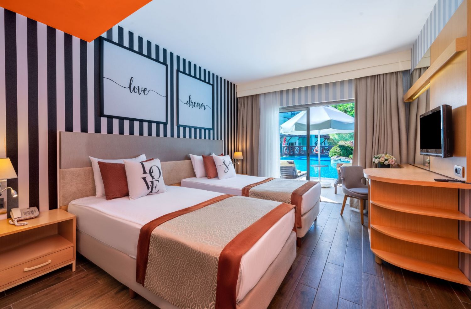Стаи Aqua Building: 105 Aqua Room (изглед градина или басейн, 27 м2), 17 Aqua Family Room (2 спални, изглед градина или басейн - 45 м2).