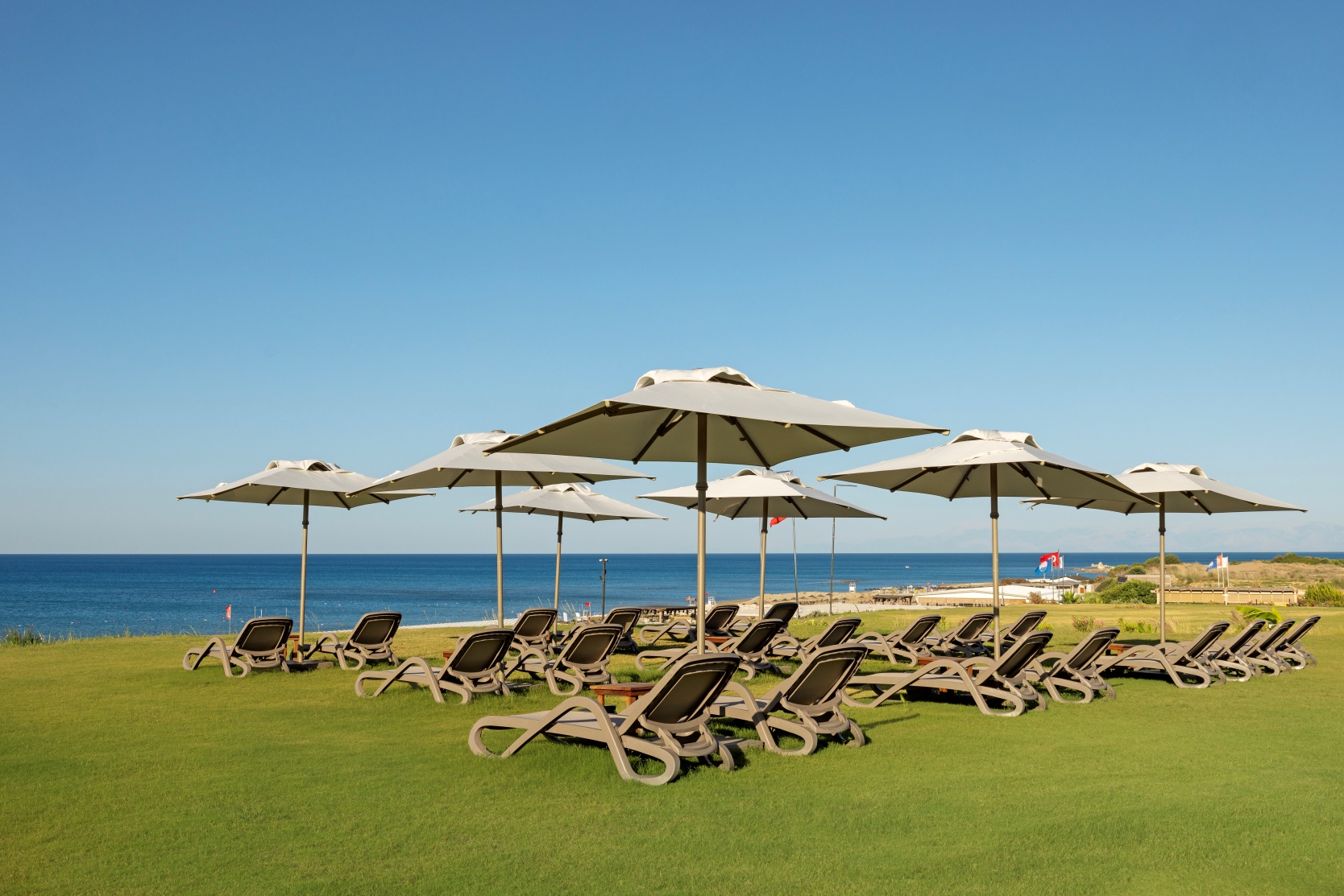Собствен, пясъчен с дължина 450 м. Чадъри, шезлонги, матраци и плажни кърпи на плажа и при басейна - безплатно.