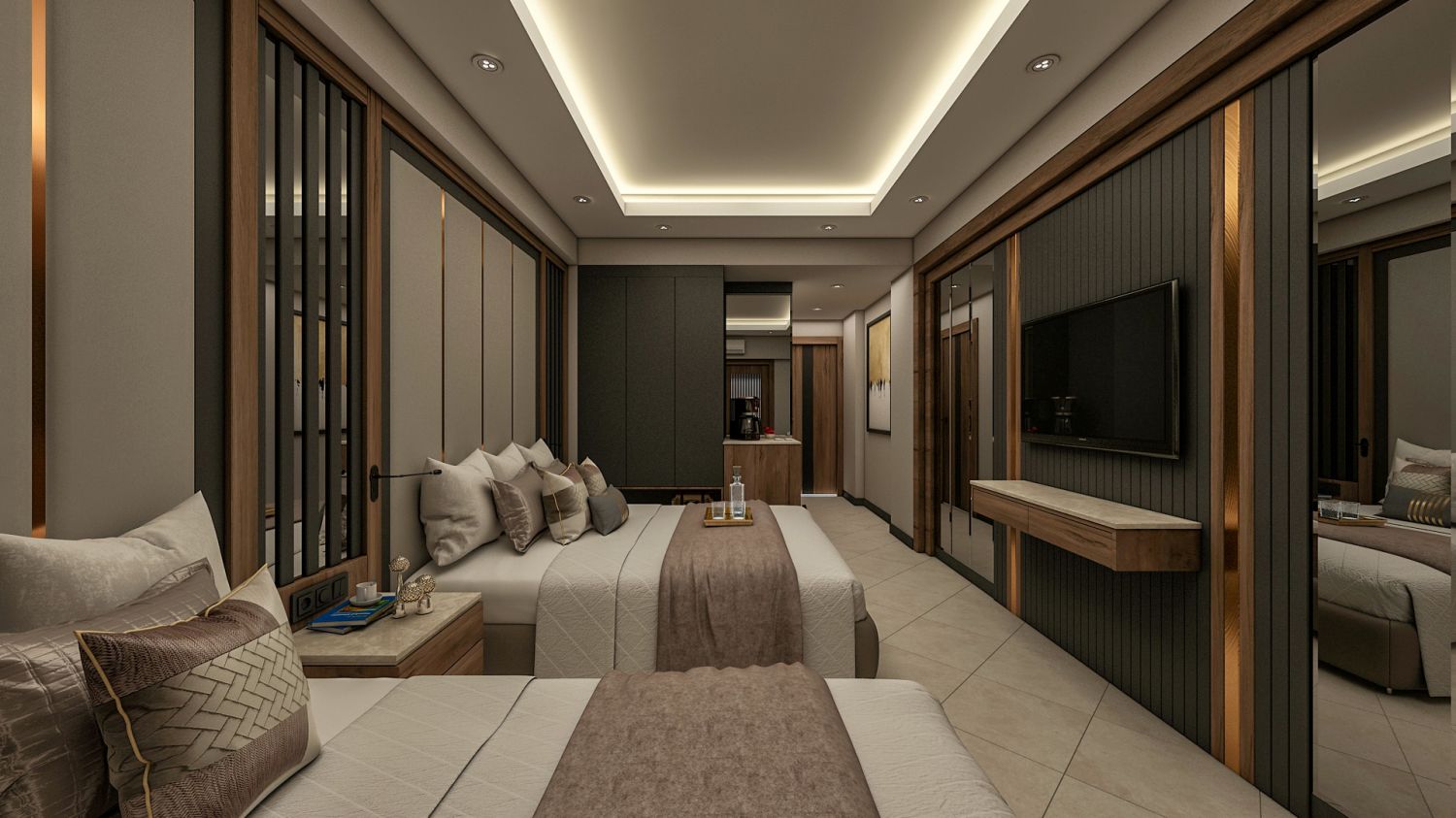 Хотелът разполага с 338 стаи, разпределени в 2 блока -  94 стандартни стаи с изглед градина (20 кв.м.), 95 стандартни стаи с изглед море (25 кв.м.), 20 фамилни стаи с изглед море (две свързани стаи, 35 кв.м.), 3 стаи за инвалиди (25 кв.м.) и промо стаи (без тераси),  37 стандартни стаи (25 кв.м.),11 лукс стаи с директен достъп до басейна (две свързани стаи, 40 кв.м.), 16 дуплекс лукс фамилни стаи (две свързани стаи, 39 кв.м.), 57 лукс фамилни стаи (две свързани стаи, 42 кв.м.), и 3 делукс суита (две свързани стаи, голяма тераса с джакузи, 61 кв.м.). Всички стаи са оборудвани с климатик, телевизор, телефон, баня с душ, сешоар, сет за чай/кафе, мини бар (платен), сейф (платен), балкон. Почистване на стаите - всеки ден, смяна на спалното бельо - 3 пъти седмично, смяна на кърпите - 3 пъти седмично.
