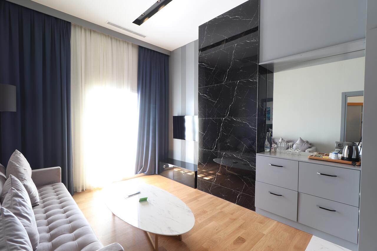 Стаи Club Room Land View (спалня, баня, изглед суша,на 2-та сграда - 22 м²), Club Room Sea View (спалня, баня, изглед море, на 2-та сграда - 22 м²), Superior Room Sea View (1 спалня, хол, 1 баня, на 2-та сграда - 91 м²), Deluxe Room Garden View (спалня, баня, изглед суша, в основната сграда - 25м²), Deluxe Room Sea View (спалня, баня, изглед море, в основната сграда - 25м²), Deluxe Suite (спалня, хол, баня - 56 м²).