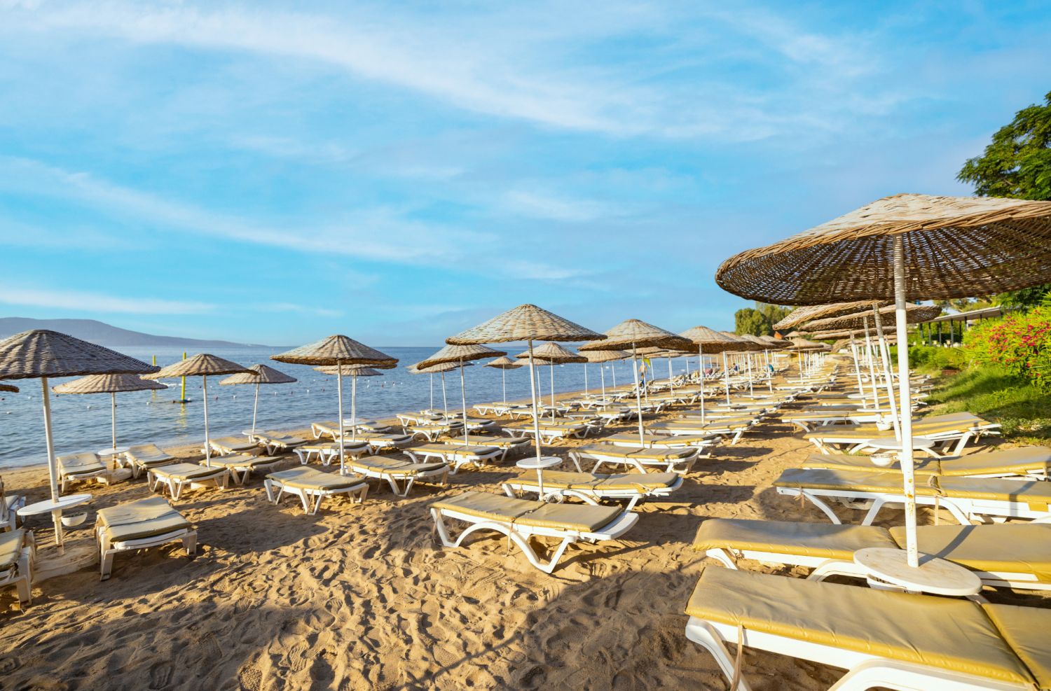 Собствен, пясъчен, притежаващ сертификат "Син флаг". Чадъри, шезлонги, матраци на плажа и при басейна - безплатно. Плажни кърпи не се предлагат.