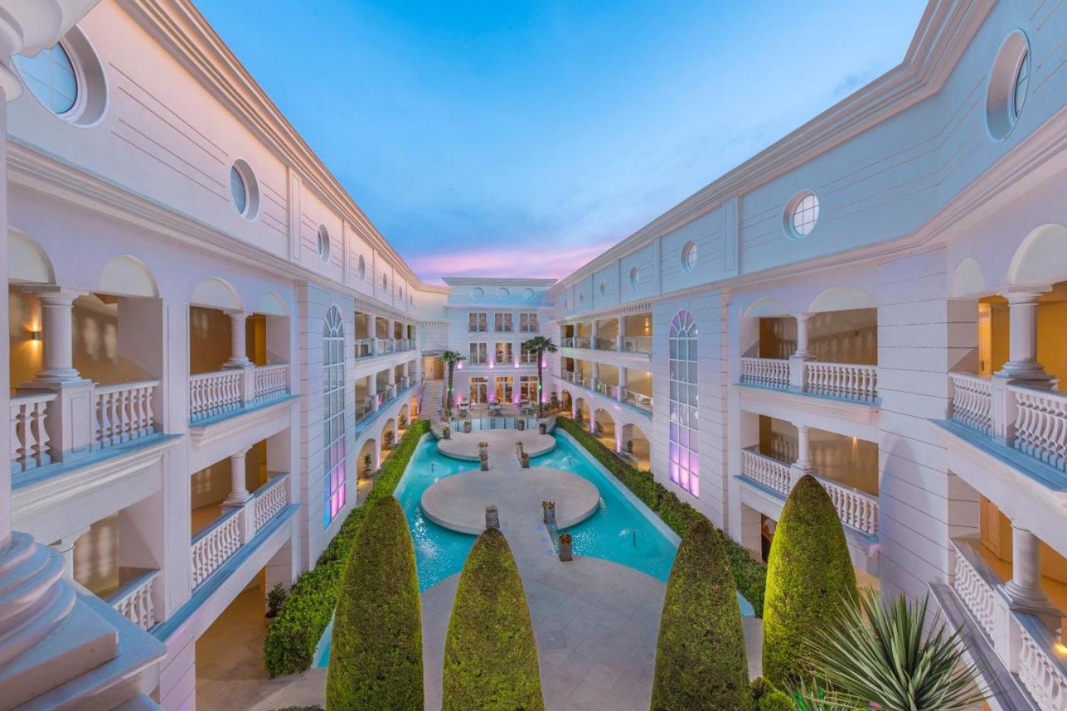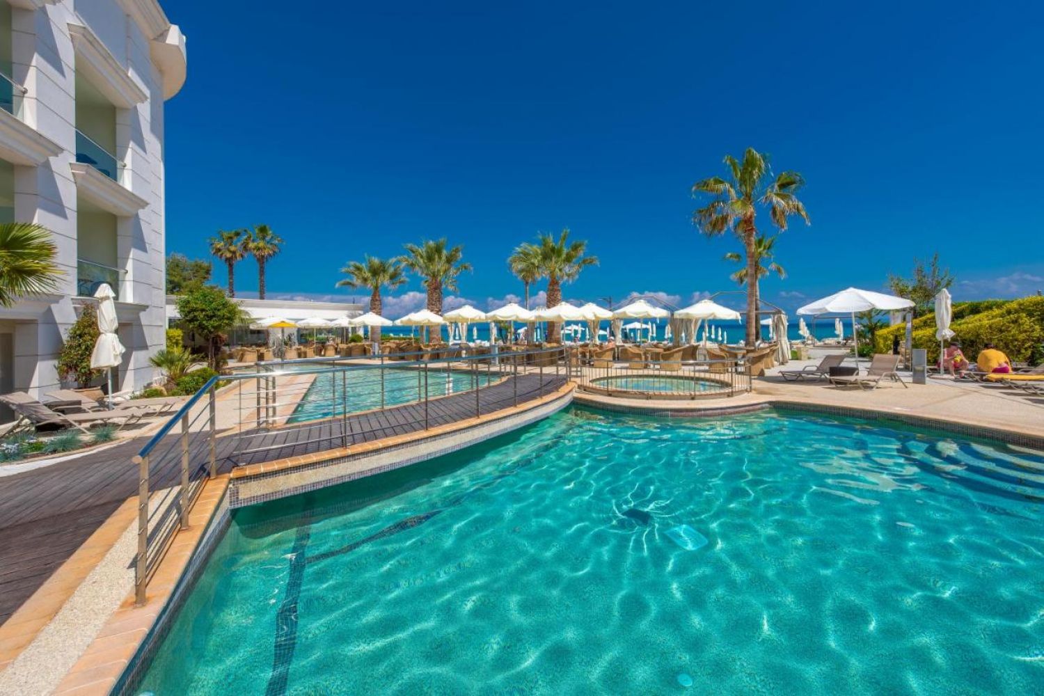 луксозни, нови мебели, модерен дизайн, индивидуален климатик/отопление, телефон, балкон, плазмен телевизор със сателит, сешоар, мини бар, сейф (срещу заплащане), луксозна баня с вана, огледало за грим, рум сървис. Двойни стаи: 24 – 27 кв. м., Стаи супериор: 27 – 30 кв. м., Семейни стаи: 35 – 37 кв. м., Апартамент: 44 кв. м., Делукс апартамент: 60 кв. м. Хотелът не предлага фронтален изглед към морето. То се вижда само странично и частично от част от помещенията, но това в никакъв случай не прави хотела по-малко прекрасен. Изгледа към градината също е по-скоро към съседните сгради, тъй като хотела е градски тип и е разположен на малка територия между други хотели.