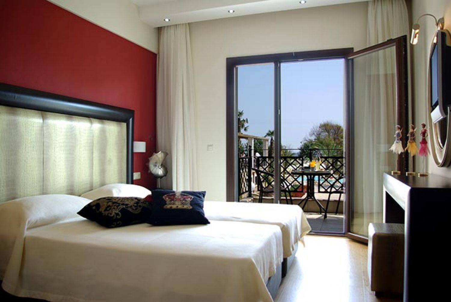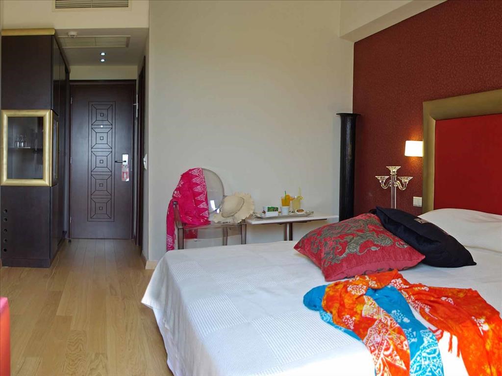 Superior Rooms спалня с двойно легло, изглед към морето и градина в хотела.