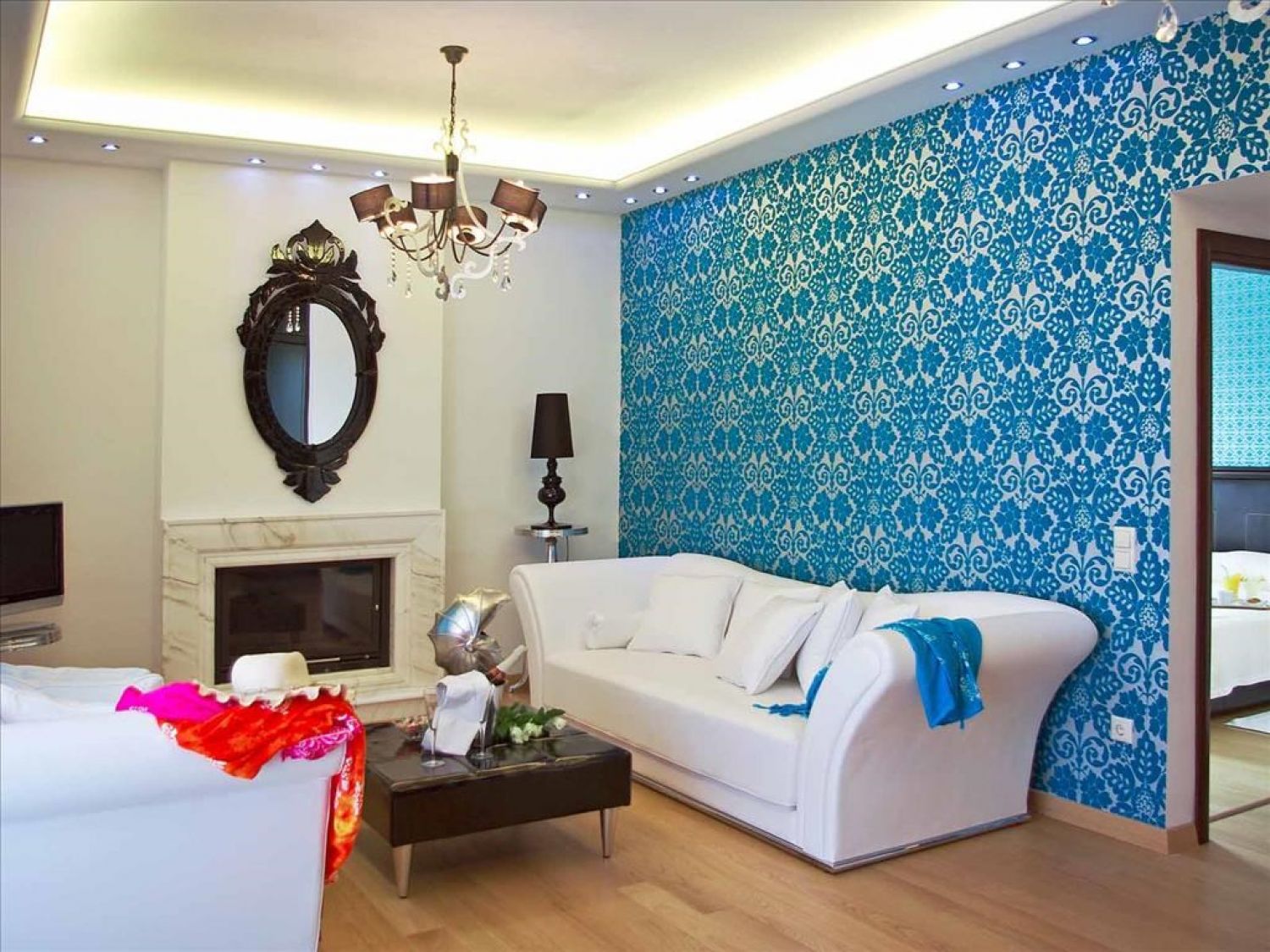 Junior Suite Комбинирана спалня (двойно легло с кръгла форма) и кът за сядане с камина, голяма обзаведена тераса с шезлонги.