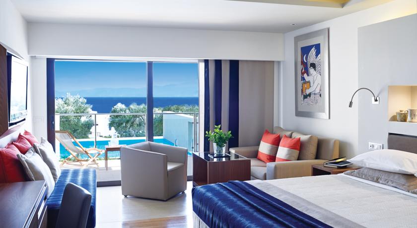 Всички стаи има директен изглед към морето, климатик/отопление, сателитна телевизия с музикални канали, телефон, безплатен Wi-Fi интернет, мини-бар (срещу заплащане), сейф (безплатно), мраморна баня (вана/душ) - музикален превод, сушилня за кърпи, халати за баня и чехли, сешоар, увеличително огледало, балкон/тераса. Porto Sea View Room: Луксозна баня, просторен балкон/тераса. Фантастична гледка към Егейско море. Идеален вариант за семейства, възможно комбиниране с други стаи (interconnecting rooms). Porto Sea View Room Sharing Pool: Стая с тераса и директен достъп до общия басейн с морска вода, предназначен само за клиенти настанени в тези стаи. Porto Sea View Superior Rooms Private Pool: Големи по площ стаи с тераса и достъп до индивидуален басейн с морска вода. Porto Sea View Suite: Суит с голям балкон. Спалня и всекидневна с разтегателен диван. Porto Sea View Suite Sharing Pool: Суит с балкон и директен достъп до общ басейн с морска вода, прездназначен само за клиентите настанени в тези стаи. Porto Sea View Suite Private Pool (~60 кв.м): Суит с балкон и директен достъп до индивидуален басейн с морска вода. Porto Sea View 2-Bedrooms Suites (~95 кв.м): Просторен суит с 2 спални, всяка от тях е оборудвана със собствена баня и балкон. Всекидневна със собствен балкон. Porto Sea View 2-Bedrooms Suite Private Pool: Идеален вариант за семейства: 2 спални (всяка с баня), всекидневна, просторна тераса, частен басейн с морска вода. Porto Exclusive 2-Bedroom Suite with Private Pool: Състои се от 2 спални с просторни бани (джакузи и душ кабини). Голяма всекидневна, трапезария, CD/DVD - плеър, просторна терасата и тоалетна за гости.