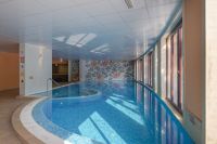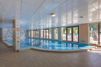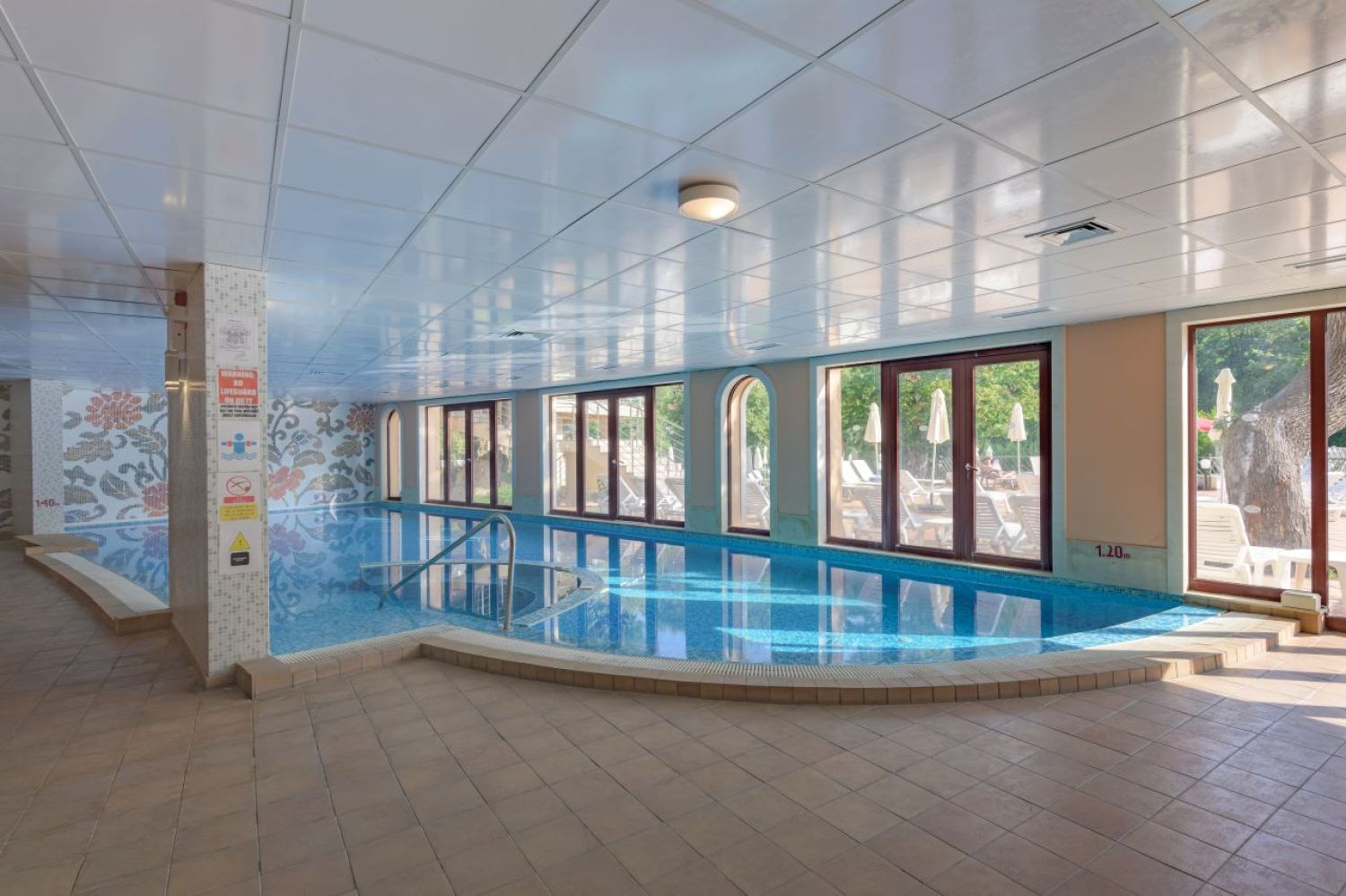 Вътрешен и външен басейни, чадъри и шезлонги на басейна, хавлия за басейн