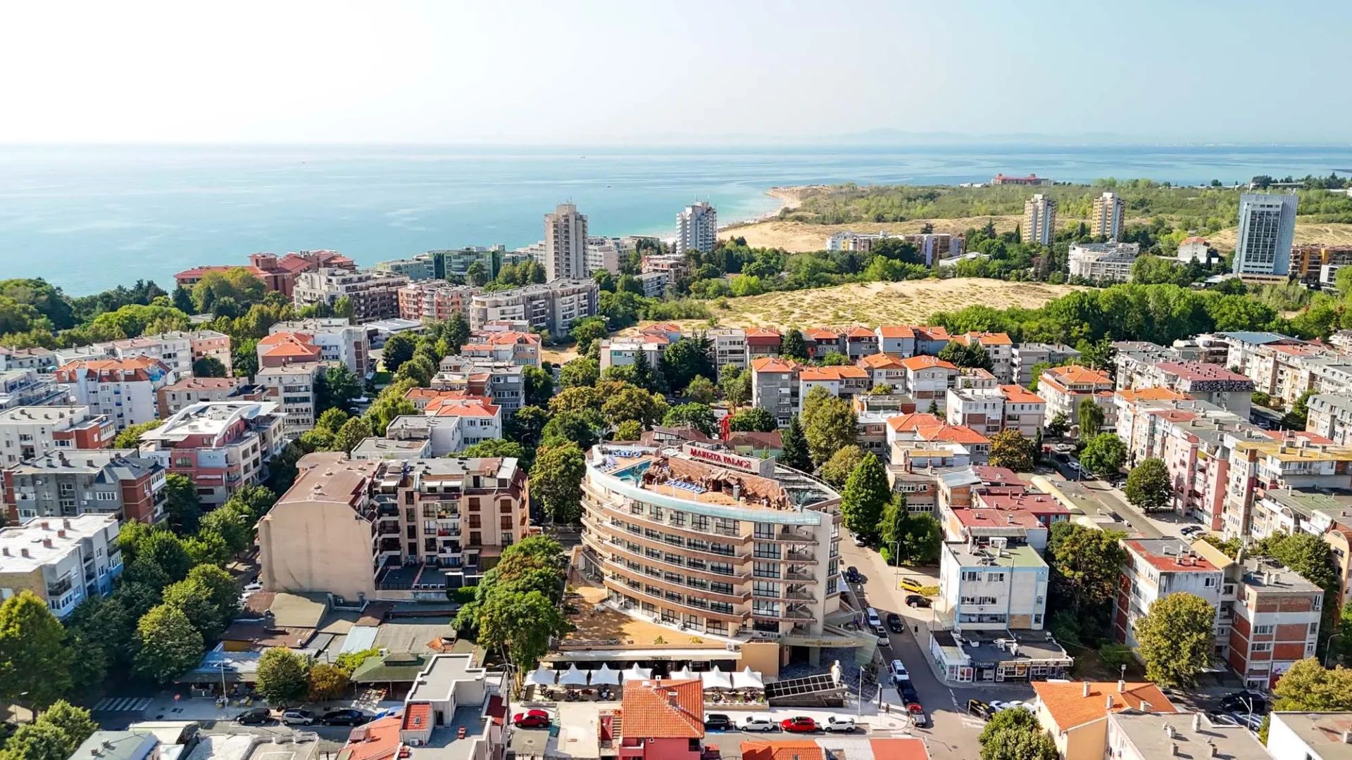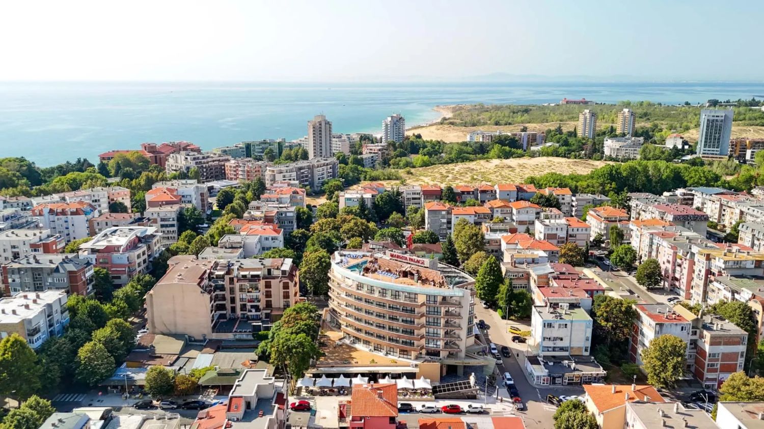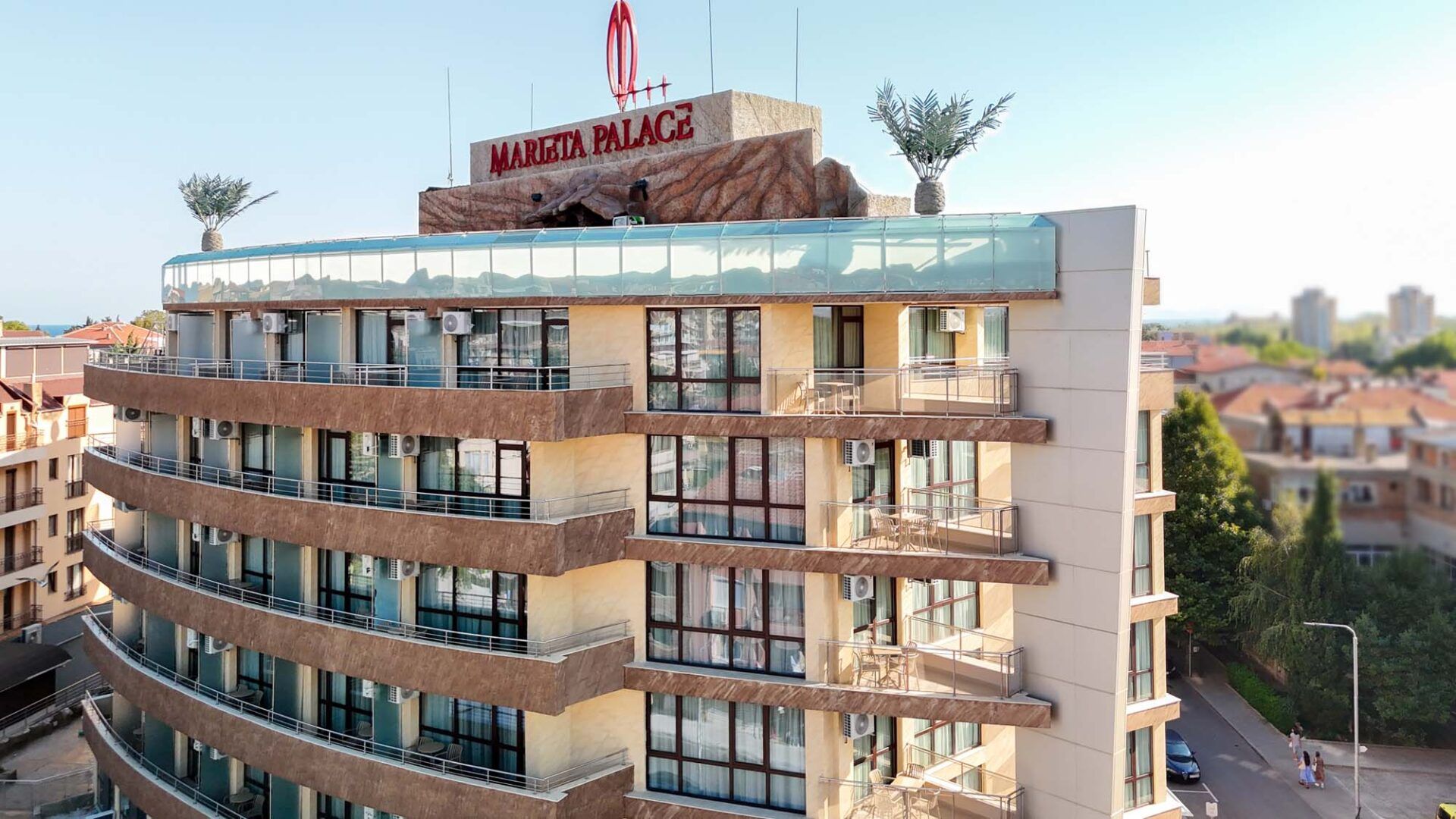 Хотел Мариета Палас 4* се намира в новата част на Несебър, в близост до най-оживените търговски улици и само на около 500–600 метра от плажа и Стария град. Хотелът работи целогодишно и предлага отлични условия както за пълноценна почивка, така и за бизнес събития.