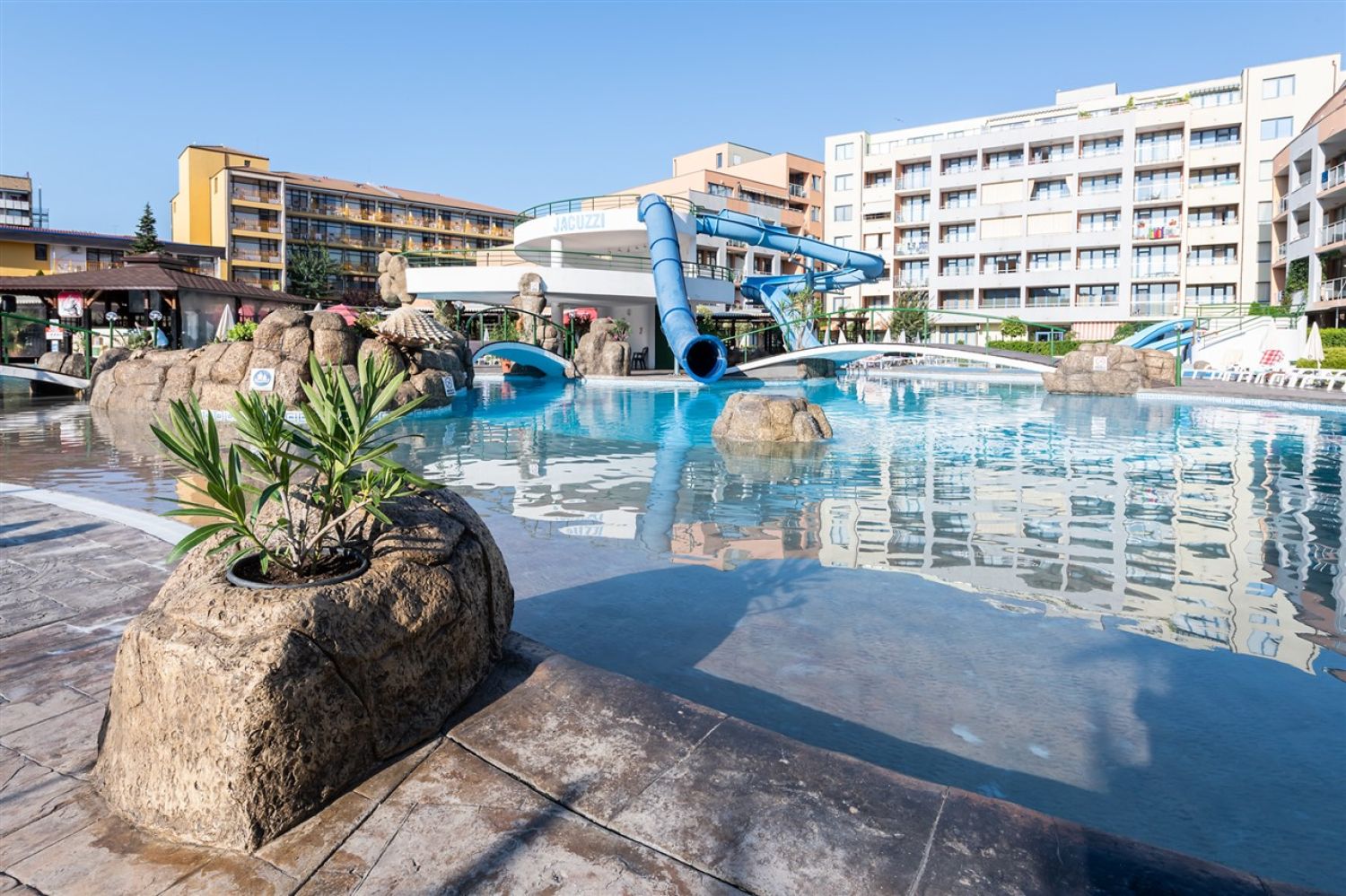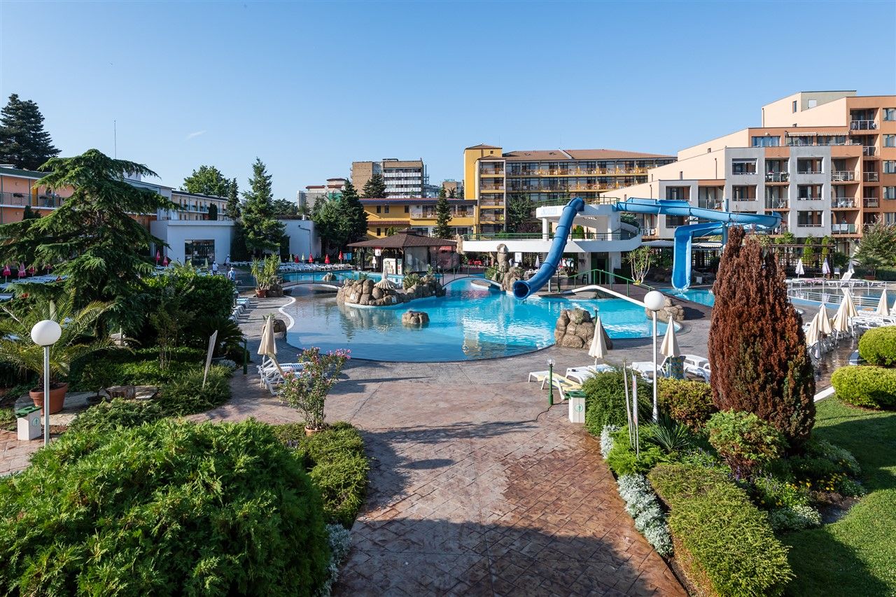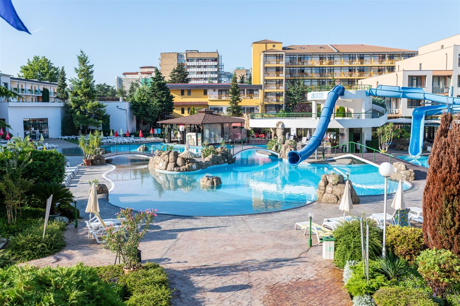 Един от основните акценти на хотела е големият открит басейн с водни пързалки, джакузи и отделна детска секция, което го прави особено подходящ за семейства с деца. Допълнителните удобства включват анимация през активния сезон, детски кът, магазини и паркинг.