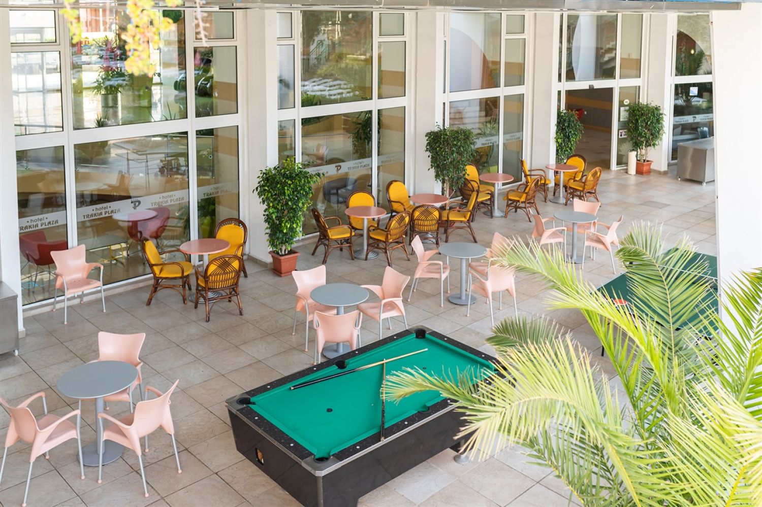 Хотел Тракия Плаза работи на база All Inclusive, като основният ресторант предлага разнообразие от български и международни ястия, а лоби барът и барът при басейна осигуряват освежаващи напитки през целия ден.