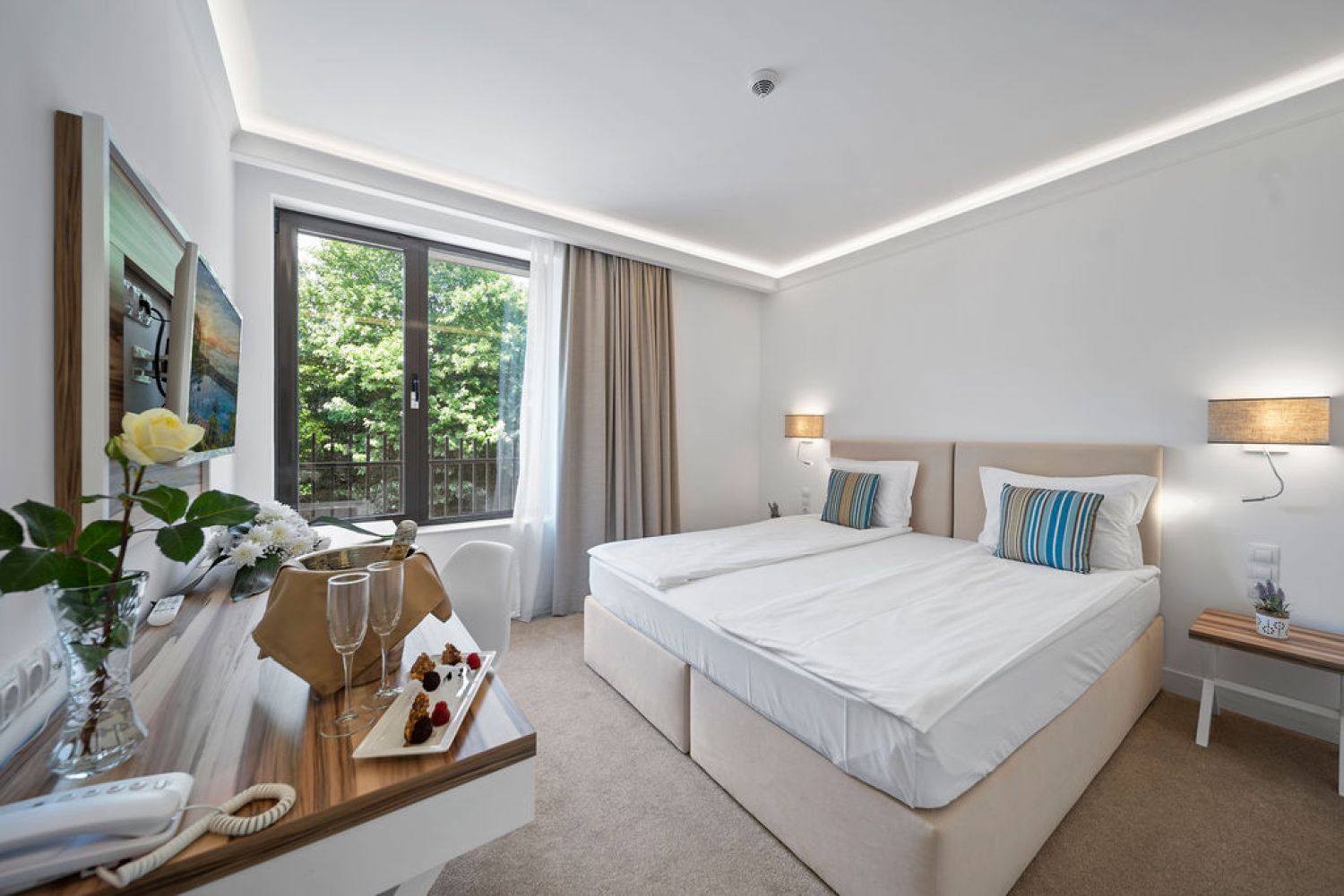 Изцяло реновиран и с ограничен капацитет от около 70 стаи, HVD Нимфа е насочен към възрастни гости (Adults Only 18+), което го прави особено подходящ за двойки и хора, търсещи тишина и релакс. Стаите са стилно обзаведени, оборудвани с климатик, телевизор, минибар (зареждан ежедневно), сейф и балкон, като много от тях предлагат впечатляваща гледка към морето.