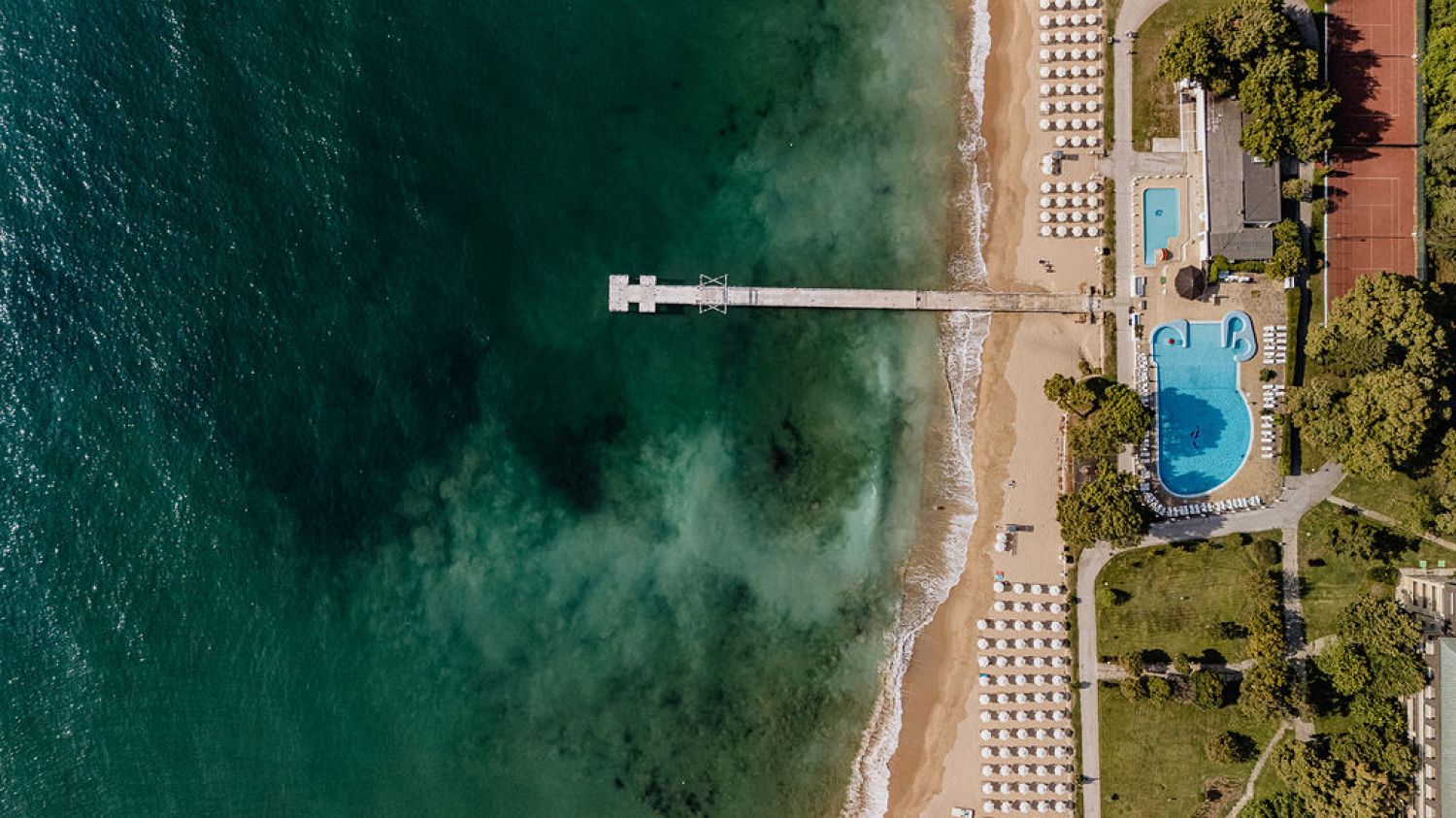 Разположението на първа линия е едно от основните му предимства – хотелът има лесен достъп до собствен плаж с осигурени чадъри и шезлонги, както и открит басейн с минерална вода.