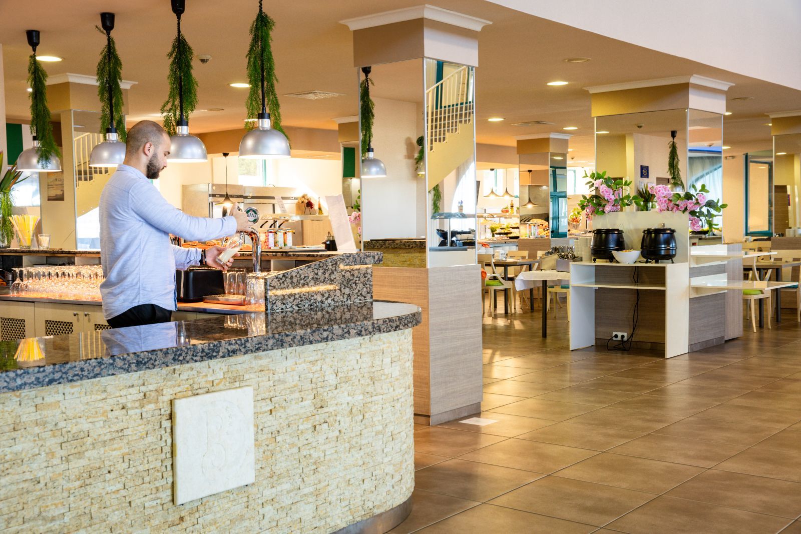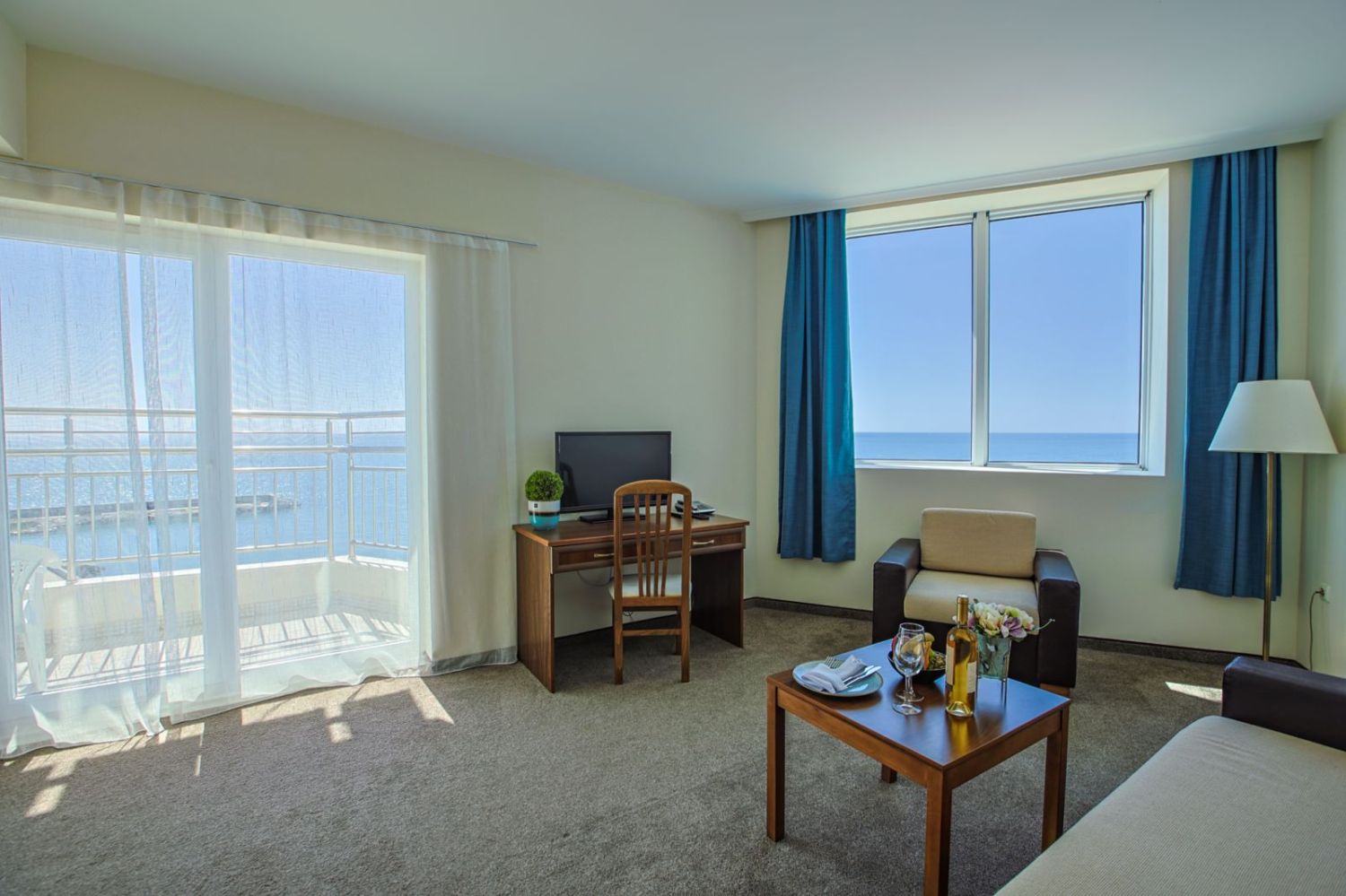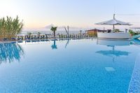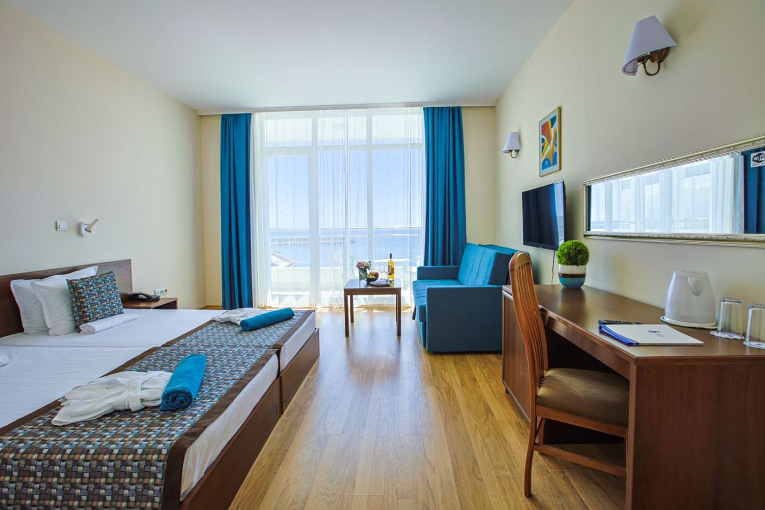 Хотелът разполага със специфична архитектура и се състои от няколко сгради с различна височина, в които са разположени комфортно обзаведени стаи, студиа и апартаменти. Всички помещения разполагат с балкон, климатик, телевизор, минибар (при заявка), сейф и безплатен Wi-Fi, като част от тях предлагат гледка към морето.