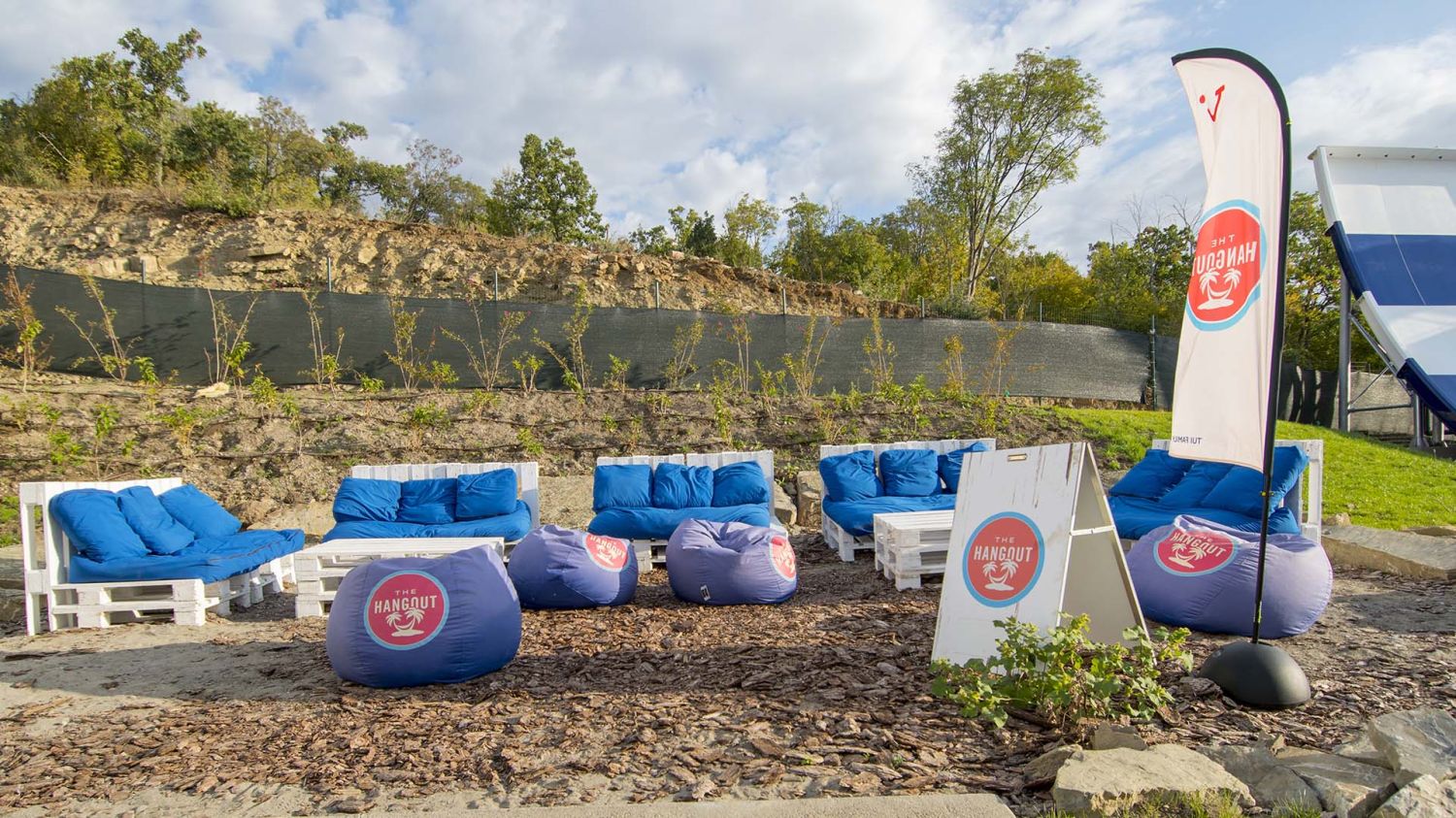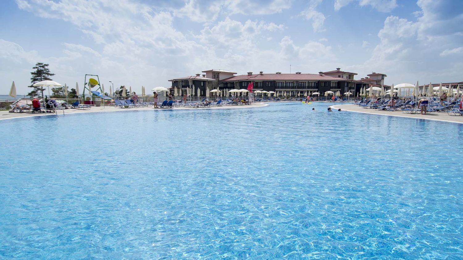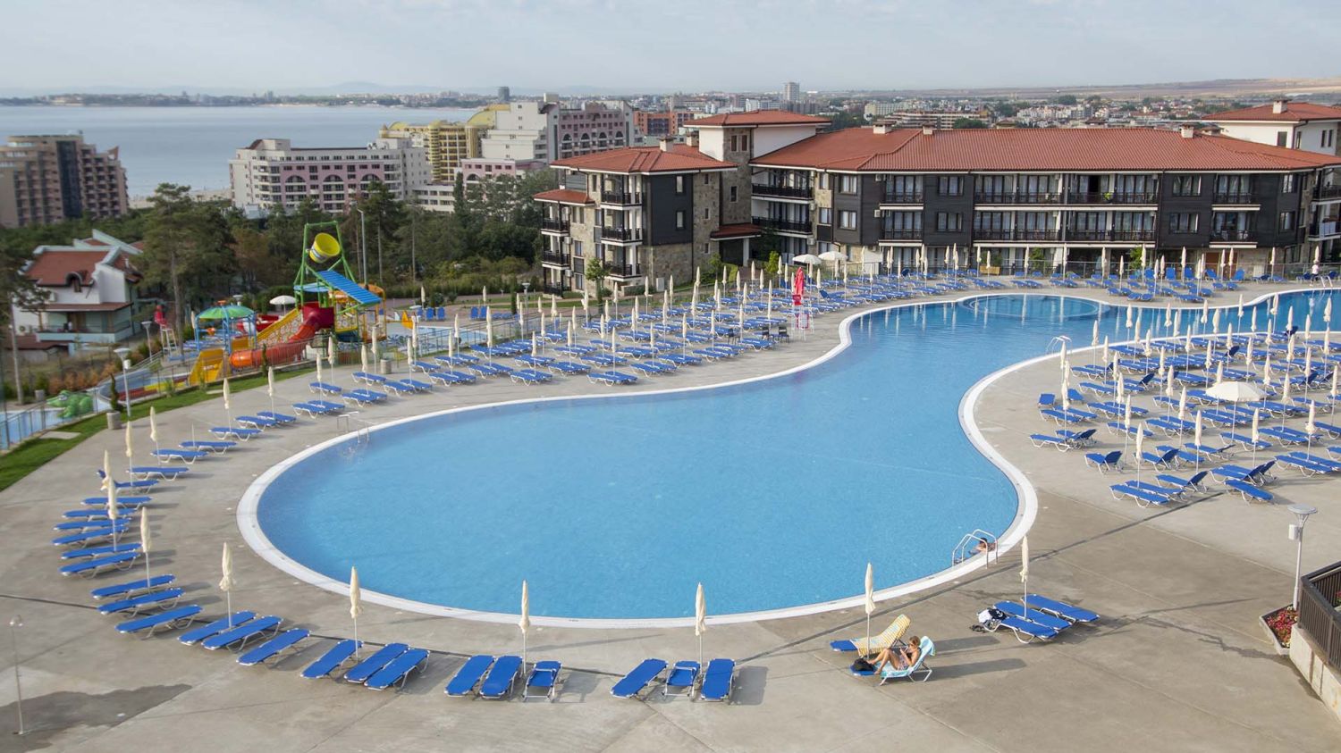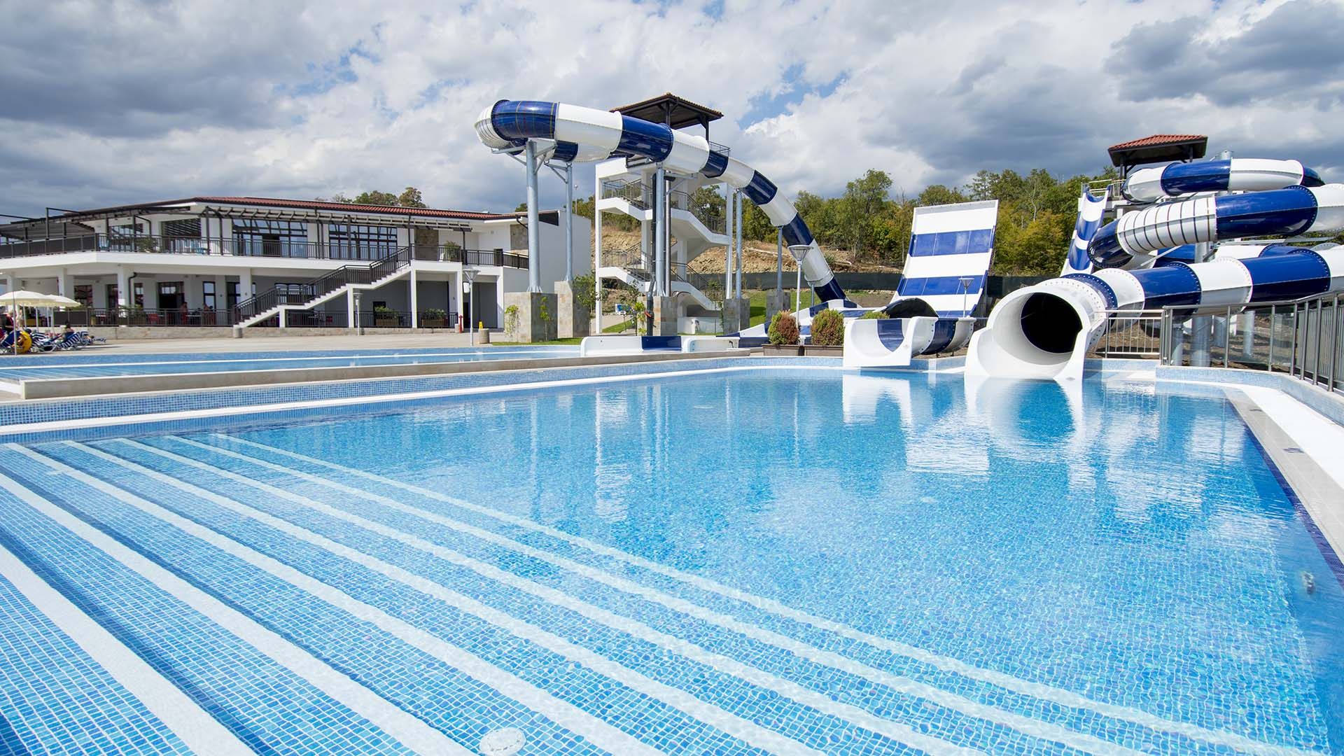 Зелените зони около аквапарка и тропическите палми създават усещане за ваканционно летуване, съчетавайки динамиката на водните забавления с възможността за спокойна почивка на плажа.