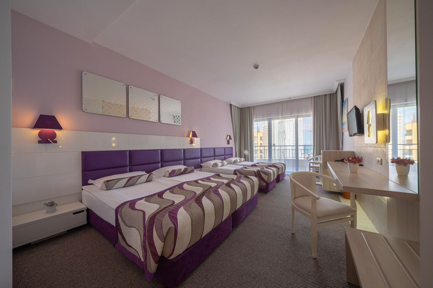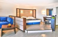 Хотелът предлага настаняване в разнообразни типове помещения, като общият брой стаи и апартаменти е около 292. Гостите могат да избират между стандартни двойни стаи, по-комфортни делукс варианти с морска или странична морска гледка, по-просторни джуниър суити, както и фамилни апартаменти, подходящи за семейства. В повечето стаи има балкон, климатик, телевизор, минибар, безплатен Wi-Fi и удобства, които осигуряват приятно и спокойно пребиваване. Много от помещенията са с приятна гледка към морето или към района на курорта, което допринася за ваканционното усещане още от сутринта.